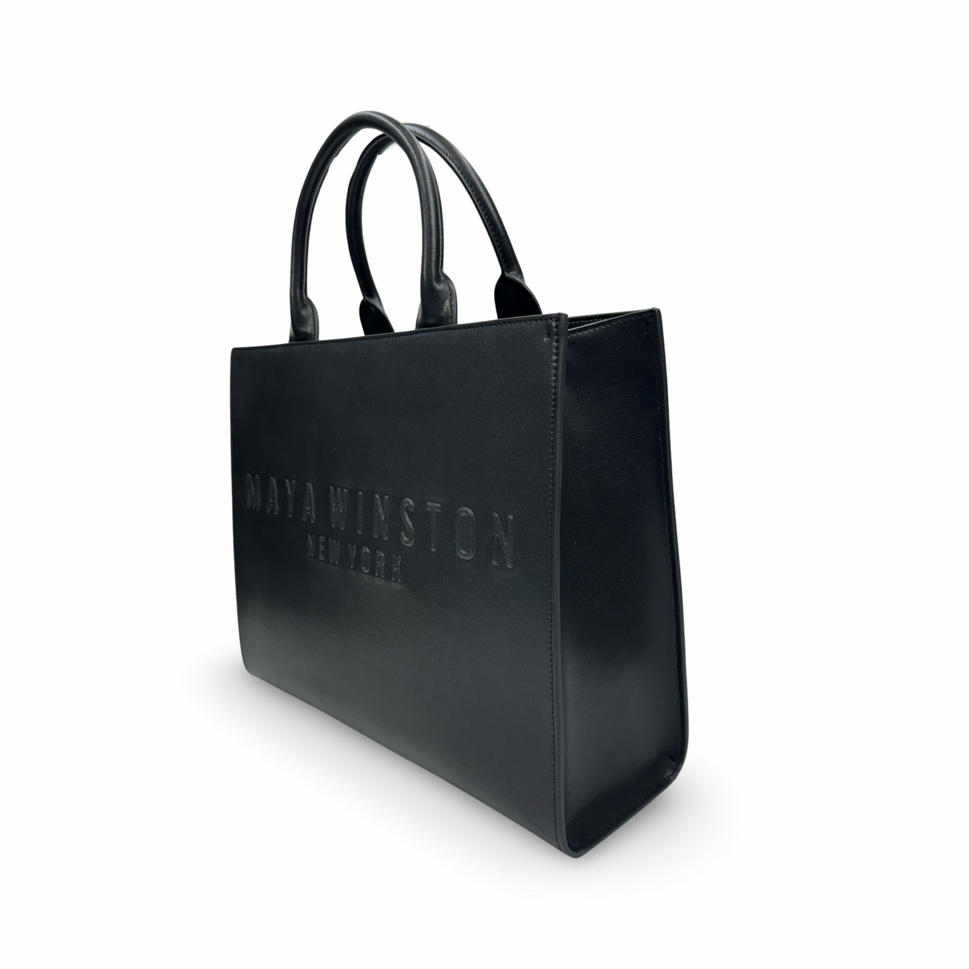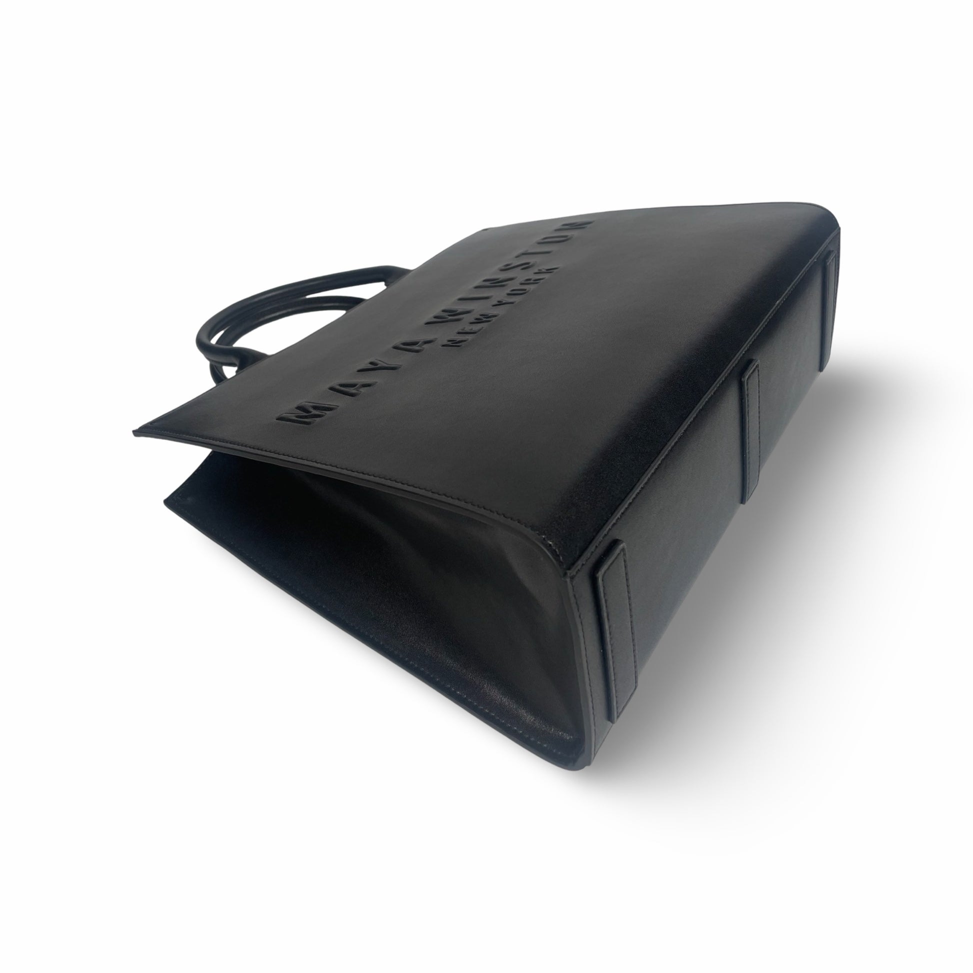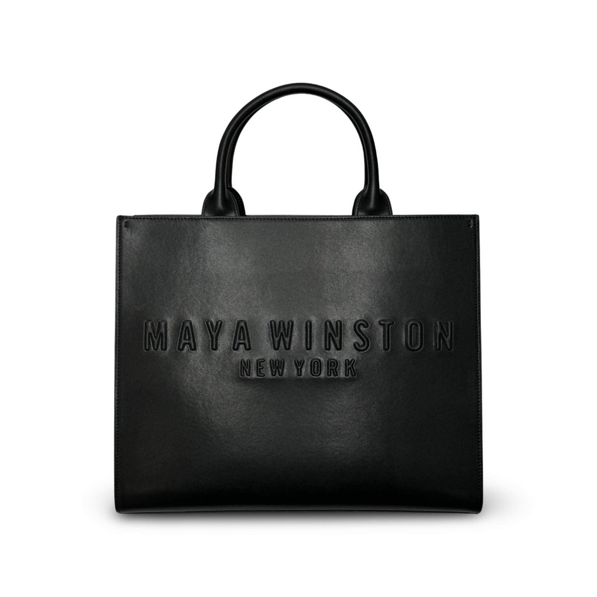 Maya Winston “Sio Tote” smooth calfskin leather tote bag with bold signature embossed logo.